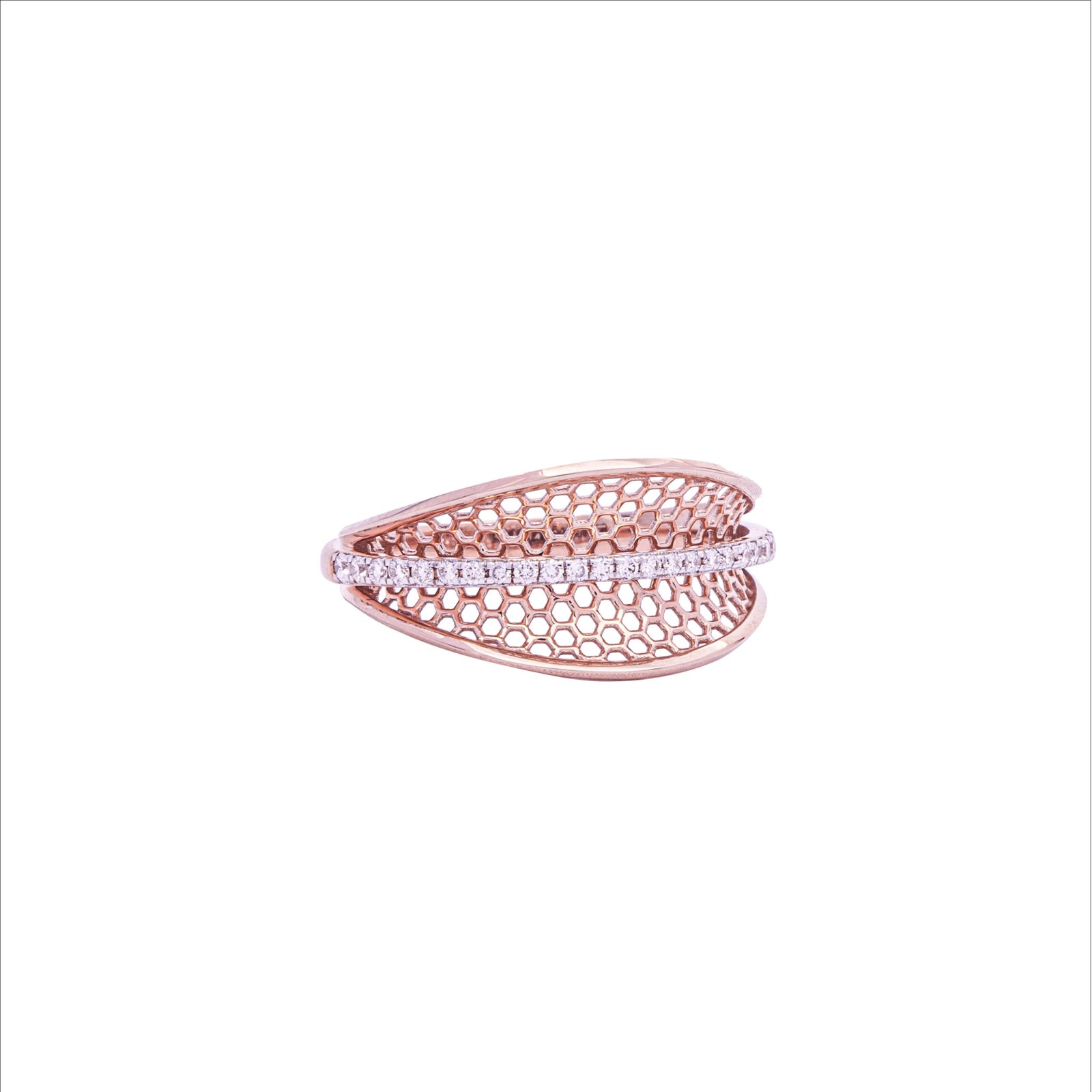 This ring features a unique honeycombed web pattern, intricately designed for a modern yet elegant look. The geometric honeycomb structure is adorned with sparkling diamonds, adding a touch of refined brilliance. Perfect for those who appreciate innovative design and luxurious detail, this ring combines a distinctive shape with sophisticated sparkle.